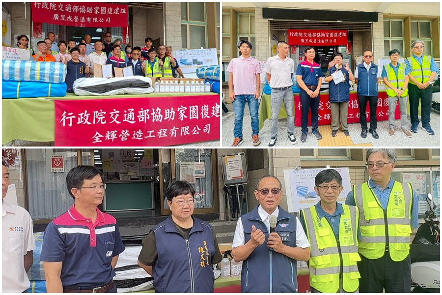 為協助南部受丹娜絲颱風及0728豪雨重創的災區復原,交通部公路局攜手營造團隊投入修繕。長期承攬南橫公路搶災與養護工作的廣昱成、全輝營造,除支援民宅修繕,28日更捐贈急需物資予鹽水區公所,展現企業社會責任。公路局副局長林聰利今至鹽水區公所,與區長陳文琪共同見證兩家廠商董事長楊善惇、楊俊德的善舉。捐贈內容包括酒精20箱、20呎×20呎帆布150個、30呎×30呎帆布150個及太空包500個,將立即投入災後重建,減輕居民生活壓力。