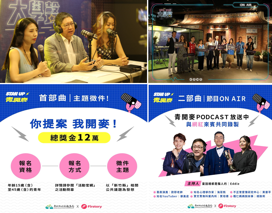 「Stan up!青開麥」系列活動及Podcast節目鎖定青年關注的公共議題,以輕鬆對談方式,探討新竹縣在地環境永續、自然生態、社福文教、都市發展及就業經濟等議題,不僅藉由青年視角切入政策推動,也期盼增加青年參與公共事務的意願,打造新世代參與城市發展的溝通橋樑。