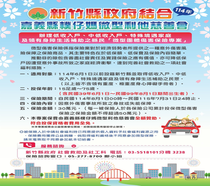 【記者彭慧婉/新竹報導】新竹縣政府攜手公益團體,自109年起推動「微型團體傷害保險」,針對15至75歲符合資格的縣民,提供免費意外傷害保障,最高理賠金額可達30萬元。今年縣府與嘉義縣樸仔媽微型利他慈善會,及全球人壽、第一產物、泰安產物、兆豐產物等保險公司合作,保障對象除低收入戶、中低收入戶與領有身心障礙生活補助的縣民外,特別將特殊境遇家庭也納入,共有6078人受惠。