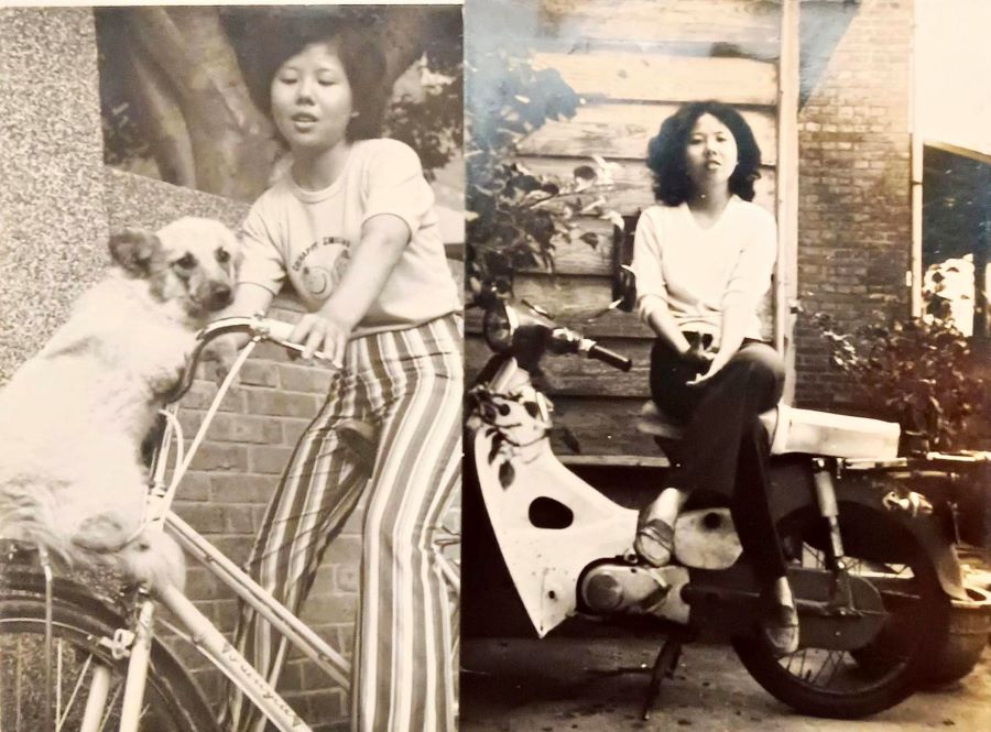 至於圖2是我兩張的年少青春照:左邊是我騎腳踏車,養寵物狗的合影,那時是少年不識愁滋味,趕上時尚穿喇叭褲,而右邊是在我家日本宿舍前留影,因我平常就喜歡照相,而當時我22歲的左右,剛從校園踏入社會的我,在父親的磚窯廠上班,坐在屬於小叔的光陽機車上,事實上是我向小叔借用這台機車,我負責存提款的會計工作,都要騎這台機車去銀行。