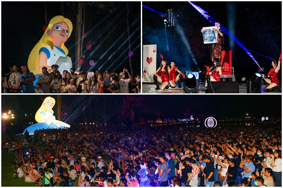 2025嘉義市光織影舞4日在北香湖公園登場,今年以「光影夢境」為主題,結合迪士尼經典動畫《愛麗絲夢遊仙境》,打造8大沉浸式展區。開幕首日吸引大批遊客湧入,夢幻光影與湖畔倒影交織,讓人宛如置身童話世界。開幕晚會由幻術師吳冠達帶來《夢境魔幻秀》,結合雷射與光影特效,營造穿越奇幻國度的震撼體驗。隨後「鐵肺歌后」戴愛玲及「情歌王子」李聖傑輪番獻唱,動人歌聲與光影投射交織,將現場氣氛推向最高潮。