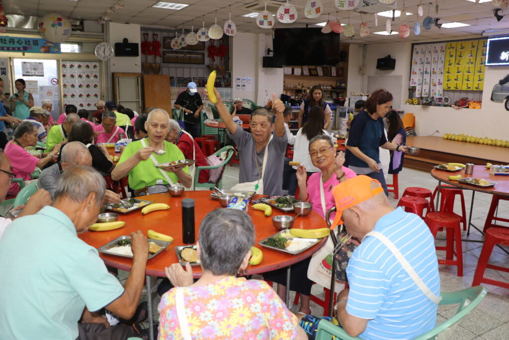 牡丹心社區理事長陳專森和雙鳳里長潘素娥在場招呼長輩,長輩和社區小朋友利用水桶鼓敲打演奏瀟灑走一回,潘素娥里長於月前發生車禍腳傷,但她仍到場參加,長輩也一一上前關心。中午時分,並在社會局主秘黃逢明、新莊區長朱思戎等人的幫忙打菜下,一起共餐。