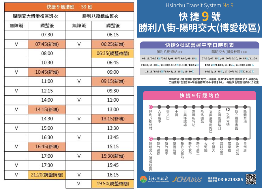 交旅處說明,第四階段於114年11月3日上線後,快捷9號每日班次由原25班次增加至33班次(往程16班次、返程17班次),其中往程(往陽明交大博愛校區方向)增加6:25、09:15、13:15、 15:30等班次,返程(往勝利八街總站方向)增加07:45、10:45、14:15、 16:45等班次,無障礙車輛班次也由8班增為16 班次。