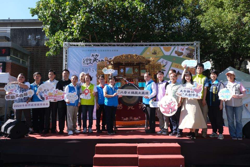 【記者彭慧婉/新竹報導】2025年「堵班鬧金秋–新竹縣八音X偶戲大匯演」與「微笑竹縣–社造聯合成果展」今(9日)在新竹縣縣史館前廣場盛大展開,由新竹縣指定登錄無形文化資產客家八音保存者田文光帶領的田屋北管八音團及國寶級布袋戲藝師李天祿創設之亦宛然掌中劇團跨界演出揭開序幕,吸引大小朋友駐足觀看,現場熱鬧滾滾。