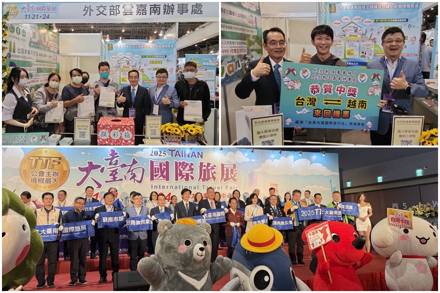 外交部領事事務局與雲嘉南辦事處今年受邀擔任旅展輔導單位,以「波鴿樂悠遊,旅安跟著走」為主題設置攤位,宣導旅外安全、急難救助及便民服務。鄭局長於開幕後前往攤位關心宣導情形,並親自見證現場舉辦的「出國機票快閃抽獎」活動,抽出兩名「臺灣─越南來回機票」幸運得主,掀起現場高潮。