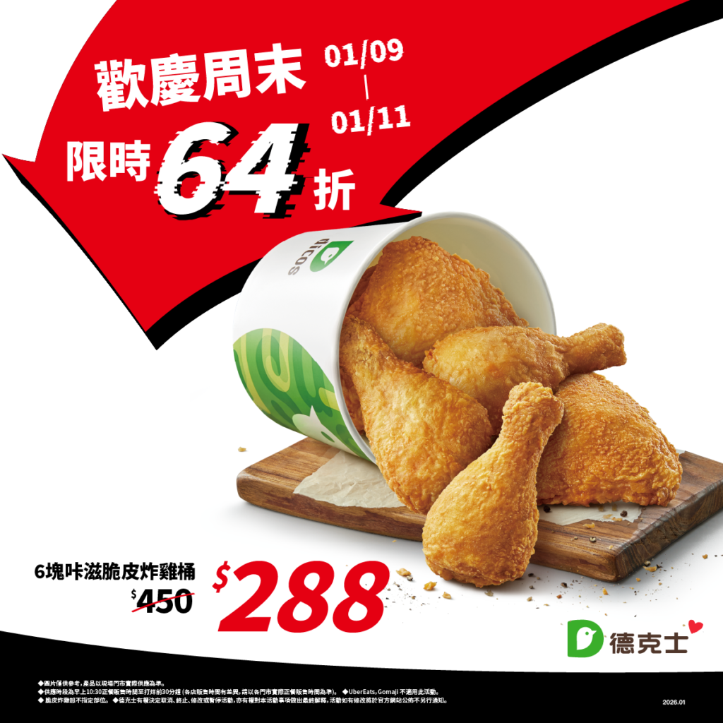 連續低溫特報來襲,脆皮炸雞專家「德克士」為替寒冷週末加溫,於 1 月 9 日星期五至 1 月 11 日 星期日推出「歡慶週末」限時優惠,主打高人氣6塊咔滋脆皮炸雞桶,整桶通通都是腿,包含 雞腿排與棒棒腿 精華部位,並嚴選 台灣本土雞 製作,原價 450 元,活動期間特價只要 288 元,等同直接下殺 64 折,成為寒冷週末最暖心的炸雞選擇。