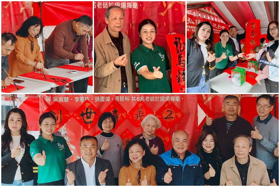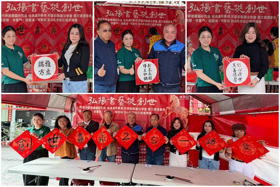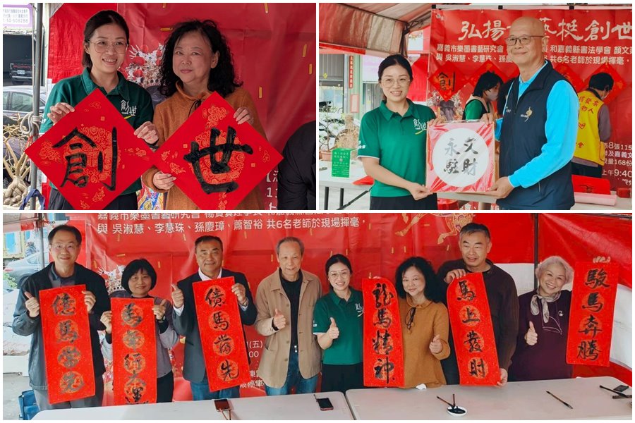 由嘉義市樂墨書藝研究會楊貴真理事長、嘉義縣書法學會顏文建理事長及中華民國樂齡陽光公益協會洪鼎為理事長共同發起「弘揚書藝挺創世」公益活動,與吳淑慧、李慧珠、孫慶璋、蕭智裕共6名老師於現場揮毫,加上文財殿主任委員吳憲育及總幹事林天河大力支持,提供限量168份錢母,民眾現場捐助8張發票,就能索取書藝作品及錢母。1月31日適逢創世基金會嘉義院在地服務邁入第25年,也邀請長年支持的善士到場參與,由院長蕭伃雯致贈墨寶感謝,讓廟前充滿濃濃的歲末感恩與年節氛圍。