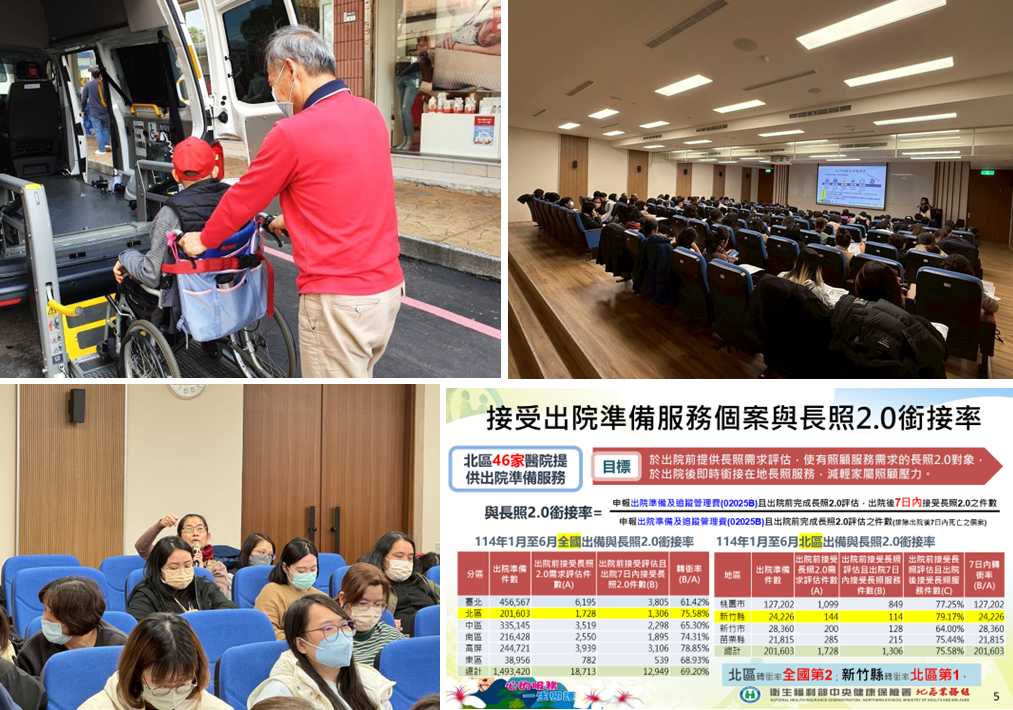 健保署北區業務組於會中公布「114年1月至6月接受出院準備服務個案與長照2.0銜接率」統計資料顯示,北區整體表現優異, 北區(含桃竹竹苗)整體銜接率為 75.58%,高於全國平均的69.20%,位居全國第二。其中新竹縣在北區各縣市中,以 79.17% 的銜接率拔得頭籌,榮獲北區第一名的好成績。