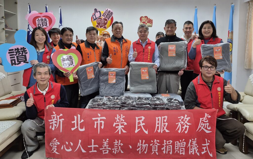 ▲陸海空軍相互關懷協會捐贈保暖物資,與榮服處同仁合影。(圖/新北市榮民服務處提供)