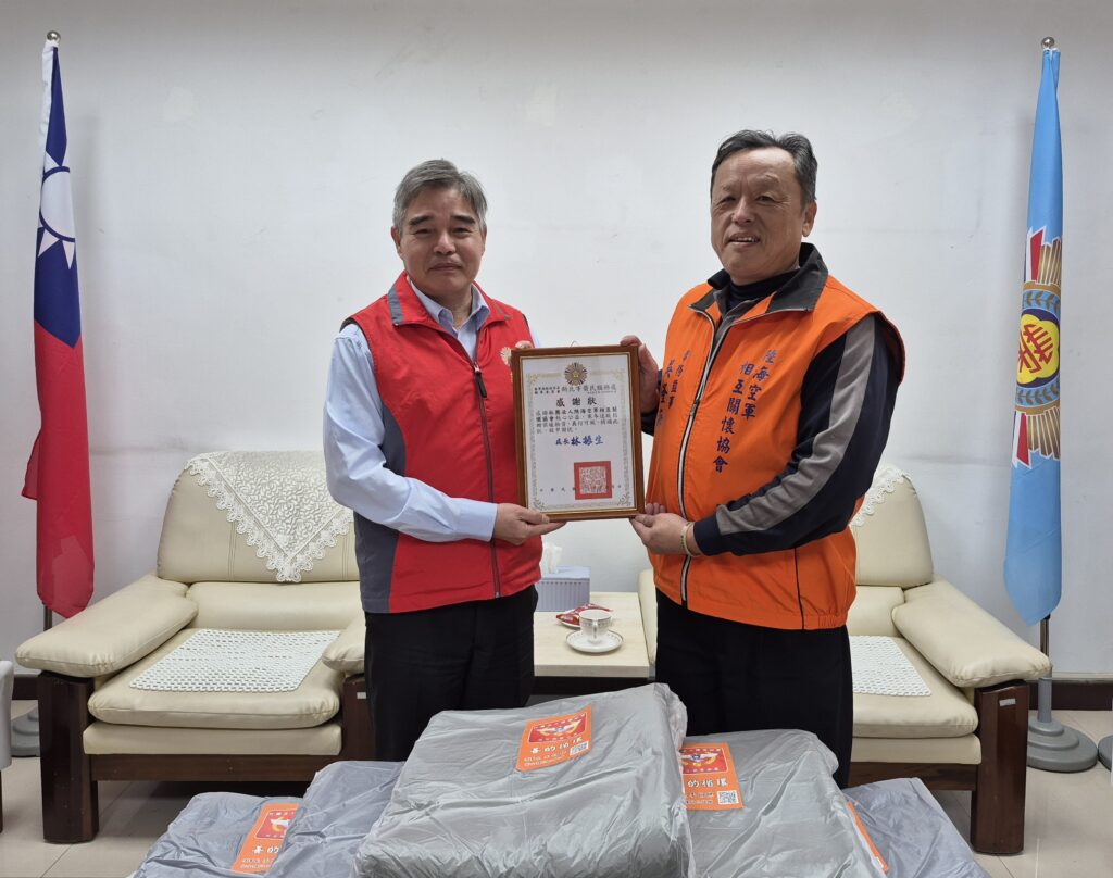 ▲吳常務監事(右)致贈保暖物資,由林處長(左)回贈感謝狀。(圖/新北市榮民服務處提供)