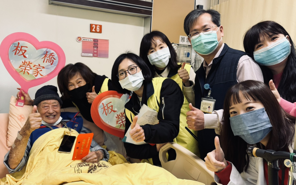 在醫護人員的陪同下,板橋榮家大家長家逐一走進病房,親切關心長輩們的身體狀況與生活起居。當住院的榮民伯伯看見前來慰問人員探望,臉上不禁露出燦爛笑容,病房裡瀰漫著如家人相聚般的溫馨氣氛。