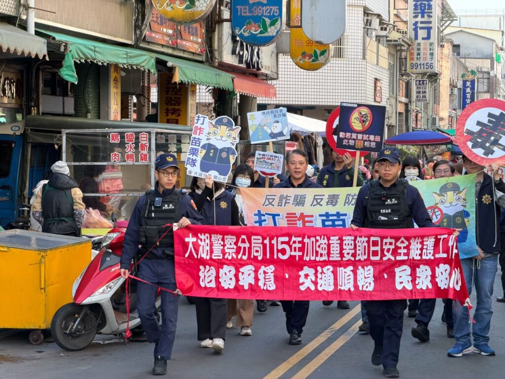 圖說:大湖分局走入街頭,提醒鄉親守住錢包、平安過年,農曆春節將近,家人團聚、返鄉出遊機會增加,但同時也是詐騙與交通事故的高風險時期。(圖/民眾提供)