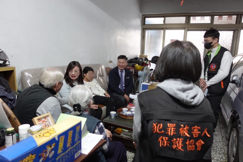 【記者彭維權/苗栗報導】農曆春節將至,為持續關懷去年10月發生之苗栗市區隨機攻擊案件3位被害人及其家屬,本署結合財團法人犯罪被害人保護協會臺灣苗栗分會(下稱犯保苗栗分會),由林映姿檢察長帶領陳有昆主任委員、賴桂烟主任及李鈞暉書記官長,於(10)日前往案家進行關懷訪視,並致贈春節關懷金及物資。