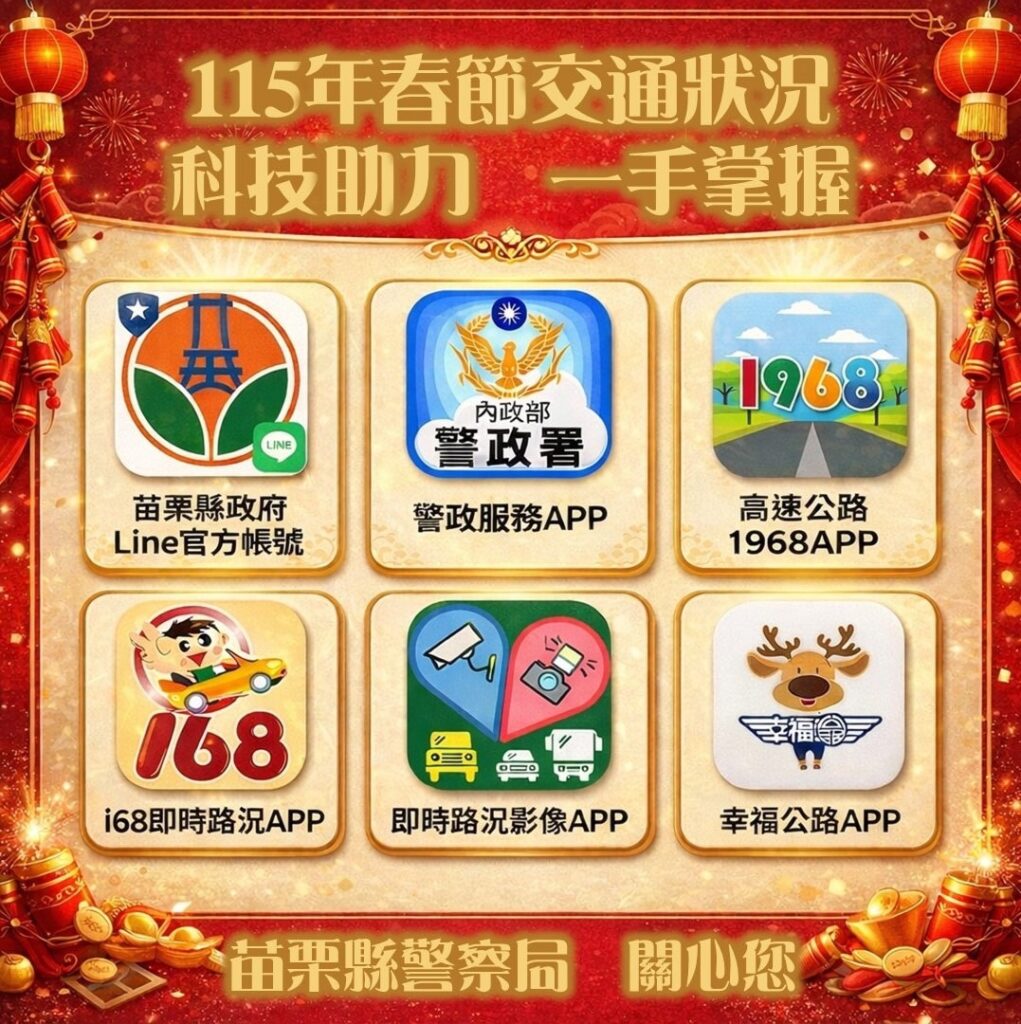 為協助民眾即時掌握路況,大湖分局也提醒善用多項交通資訊工具,包括加入「苗栗縣政府」LINE官方帳號獲取旅遊與交通資訊、下載「警政服務」APP查詢即時路況;行駛國道可使用「高速公路1968」APP掌握國道疏導措施;行經省道及主要道路,則可透過「i68即時路況」、「即時路況影像」及「幸福公路」等APP查詢台3線、台72線及周邊道路最新車流與影像資訊,彈性調整行程。