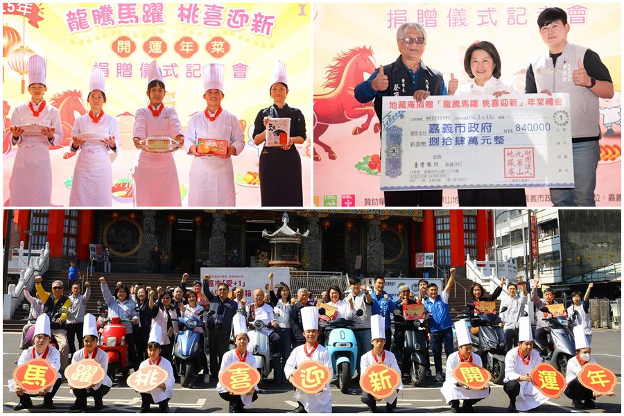 春節將至,嘉義市政府12日攜手九華山地藏庵舉辦「龍騰馬躍 桃喜迎新」開運年菜捐贈活動,募集年菜與祈福物資,由嘉義市餐飲業職業工會協助料理,發送給420戶弱勢邊緣戶與獨居長者,讓更多家庭安心迎新年。市長黃敏惠強調,市府將持續結合民間力量,擴大社會安全網,讓弱勢家庭在節慶時刻也能感受溫暖與關懷。
