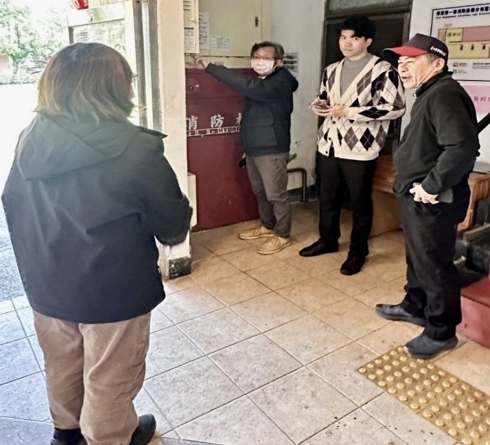 ▲林副主任(右三)一行至住民生活區域檢查消防警報等設備。(圖/台北榮家提供)