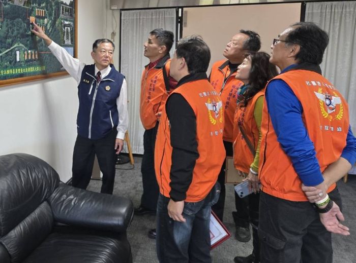 ▲陳家主任(左)手指空拍全景圖向來訪嘉賓們介紹家區環境。(圖/台北榮家提供)
