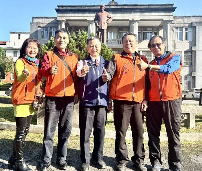 ▲陳家主任(中 )與李理事長(左二)一行在蔣公銅像前合影留念。(圖/台北榮家提供)