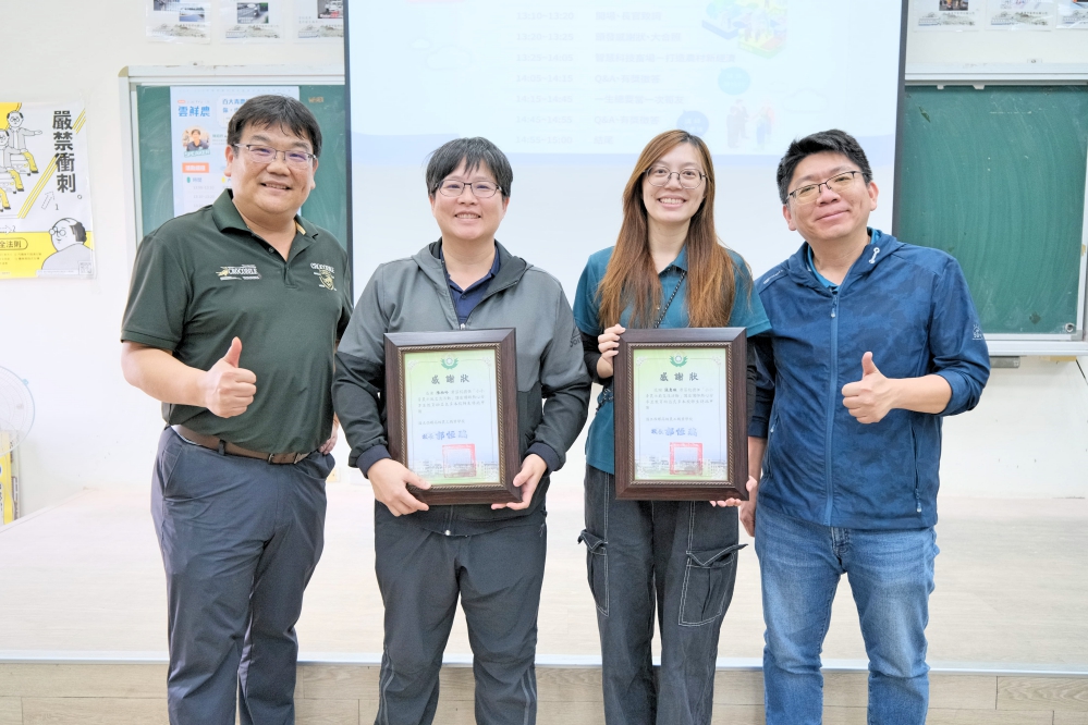 ▲雲林縣政府農業處蔡耿宇副處長(右1)與西螺農工蔡明勳實習主任及兩位青農講者合影,展現產學攜手培育青年農業人才的決心。(圖/中衛發展中心提供)