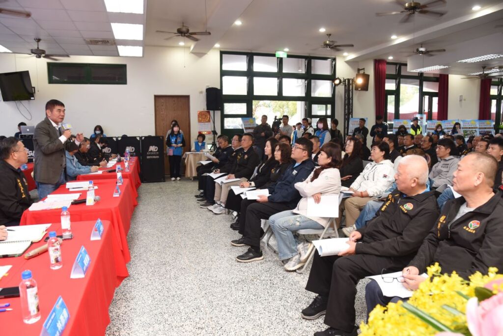 圖說:縣長鍾東錦帶領局處長舉辦「縣長下鄉座談會」,首站開抵苗栗市玉華里活動中心,邀請縣籍立委、縣議員、鄉鎮市長、代表、村里長、社區發展協會理事長及農漁會三巨頭等各界人士,面對面討論提案交流意見。(圖/苗栗縣政府提供)