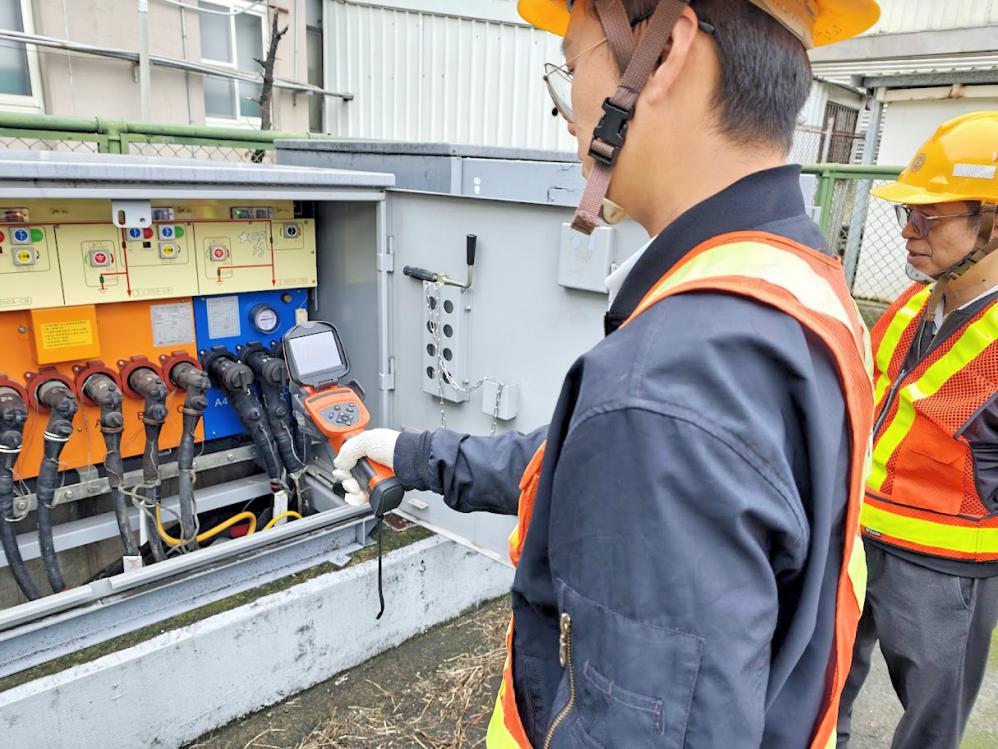 ▲台電新竹區處全面展開線路維護行動,區處同仁以紅外線儀器檢測供電設備,檢視是否有過熱狀況。(圖/台電新竹區處提供)