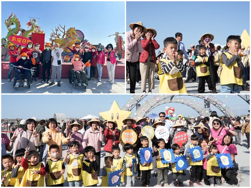 嘉義燈會主燈區11日下午出現溫馨畫面,來自 戴德森醫療財團法人嘉義基督教醫院 太保日照中心、保康社會福利慈善事業基金會 附設保康日照的長輩,以及 嘉義縣警察局職場互助教保服務中心 與嘉基早療中心親子教具屋的孩童,共約40人攜手演出兩場跨世代快閃活動,在燈海與音樂中展現「老幼共融」的溫暖互動。