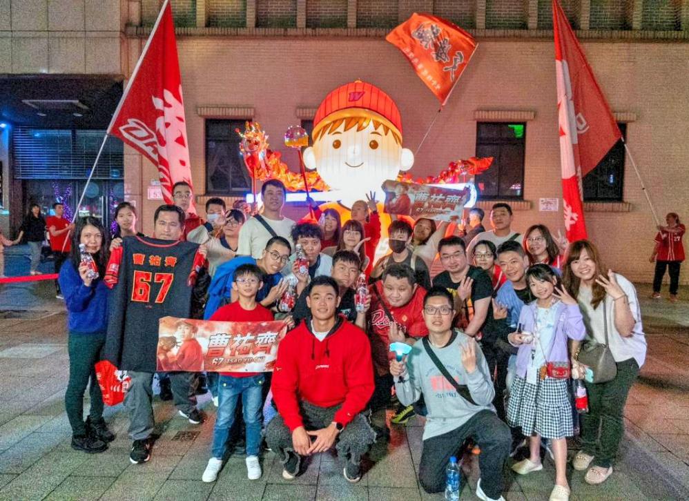 ▲頂新和德文教基金會攜手味全龍於「2026台北燈節」打造主題燈組,將棒球精神融入城市燈節場景。味全龍球星曹祐齊3/1日驚喜現身《台北主場・奔龍而上》燈組與民眾合影。(圖/頂新和德文教基金會提供)