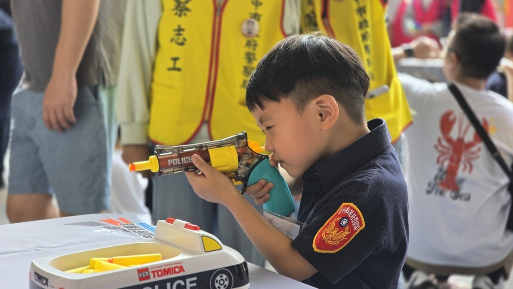本次訓練班將傳統警務體驗與趣味童玩結合,設計了多元的闖關活動,從最受期待的騎乘迷你警察巡邏重機,還有化身神射手模擬擊潰歹徒的擬真射擊打靶訓練,更把夜市經典遊戲套圈圈和釣金魚遊戲融入犯罪預防中,讓小朋友在玩樂中掌握預防詐騙、遠離毒品及交通守法等觀念。特別的是,活動現場也邀請了眾多警眷,在百忙的勤務中抽空,與小朋友一起在臺中火車站舊軌小舞台前,共同參與這場迷你制服派對,讓平時守護治安、鮮少有時間陪家人的波麗士大人們,能趁著兒童節前夕與孩子共享天倫之樂。