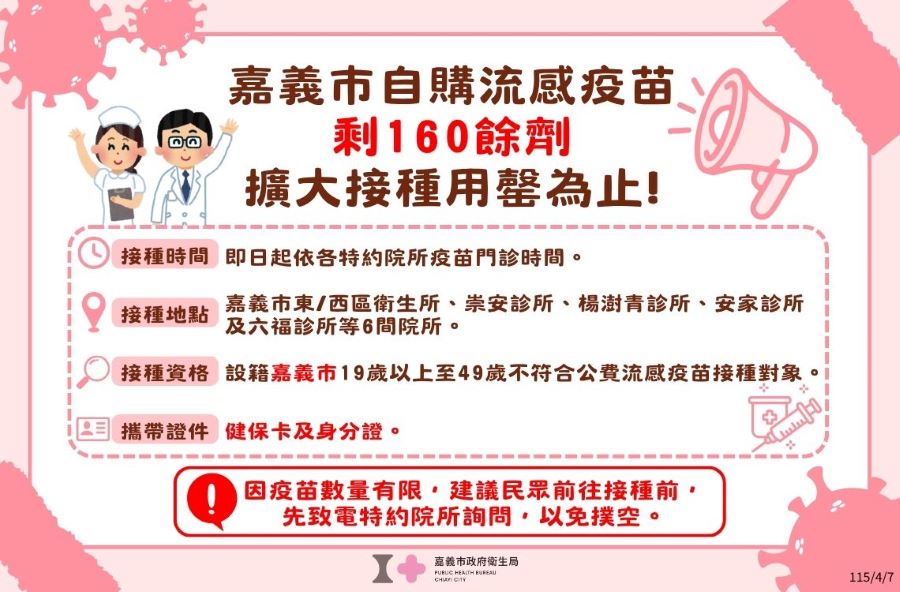 嘉義市政府宣布,即日起開放嘉義市自購流感疫苗,提供設籍嘉義市19至49歲市民免費接種,以提升社區整體免疫保護力。嘉義市政府衛生局表示,目前疫苗僅剩約160餘劑,數量有限,將採用完為止方式提供接種服務。