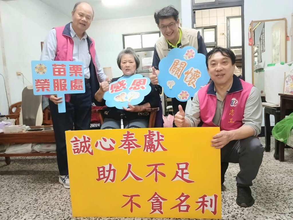 圖說:榮欣志工第一隊隊長陳龍(左一)和榮服副處柯長榮(左三),偕同隊員關心獨居長輩。(圖/苗栗榮服處提供)
