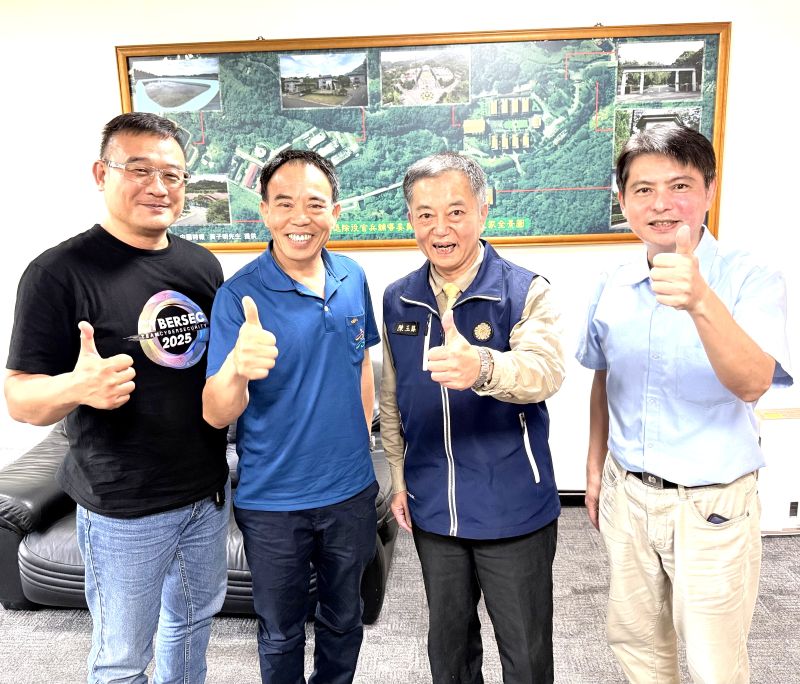 ▲陳家主任(右二)偕王組長(右一)與劉里長(左二)一行在家區空拍全景圖前合影留念。(圖/台北榮家提供)