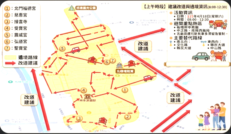 板橋北極壇遶境祈福活動,影響範圍涵蓋板橋府中商圈(府中路、文化路、館前西路)及南雅西路段周邊。活動區分為上下午時段,板橋警積極規劃交通疏導人力,以緩解交通衝擊,相關資訊如下:
