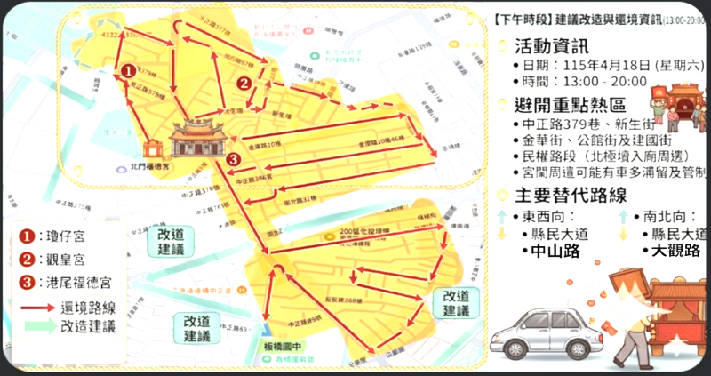 (一)避開重點熱區:當日活動期間,遶境隊伍將至上揭宮廟參拜,預計屆時宮廟周遭將出現車多、短暫滯留之狀況,且可能有間歇性交通管制。
