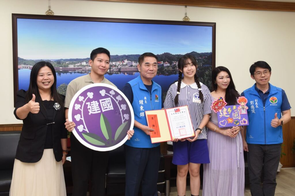 朱映潼上午由校長方麗萍及多位師長陪同接受縣長鍾東錦表彰,她最後還向鍾東錦許願「希望能體驗坐上縣長寶座的心情」,鍾東錦當場滿足其願望開心坐到縣長座位,並勉勵她勤學向上,說不定建國國中將來也產生一位縣長。