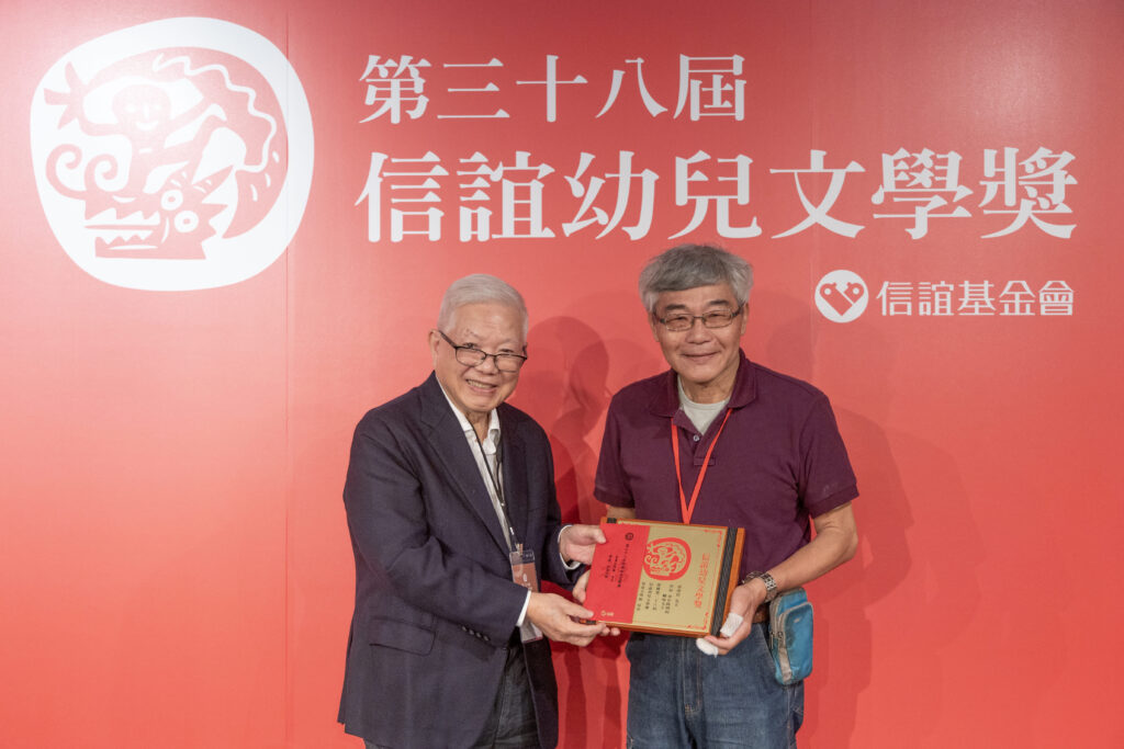 ▲信誼基金會共同創辦人何壽川頒發兒童文學佳作予70歲的退休教授蔡澤民。(圖/信誼基金會提供)