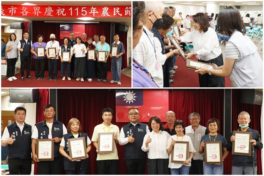 嘉義市各界24日舉辦「農民節慶祝大會」,黃敏惠市長出席頒獎,表揚126位農業績優人員,感謝農民一年來對農業發展的付出與貢獻,現場並致贈獎狀與紀念品,肯定農友長期辛勤耕耘。